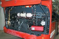 Что касается двигателя, то это — привычная сканиевская «шестерка» (9 л, 230 л.с.), только приспособленная для работы на спирту. Конструкторы отказались от электронного управления двигателем и одновременно увеличили стпень сжатия. Этанол под давлением подается в цилиндры — и воспламеняется от сжатия (поскольку, повторим, в спирт добавлены присадки, облегчающие самовоспламенение). Еще одна особенность таких автобусов — система автоматического пожаротушения двигателя. В моторном отсеке протянут красный «провод-предохранитель»: при возгорании его оплетка оплавится, и расположенный здесь же огнетушитель зальет отсек пеной.